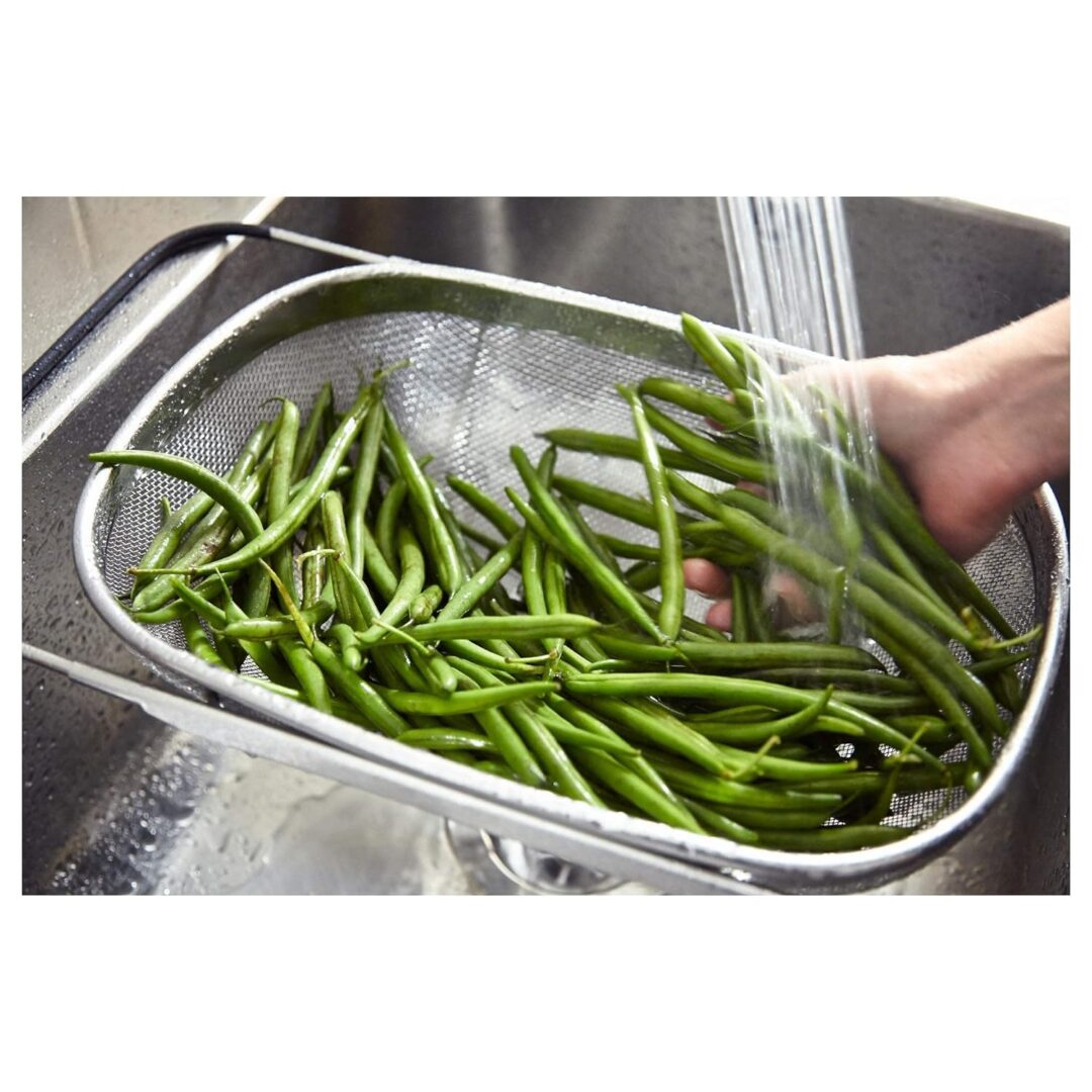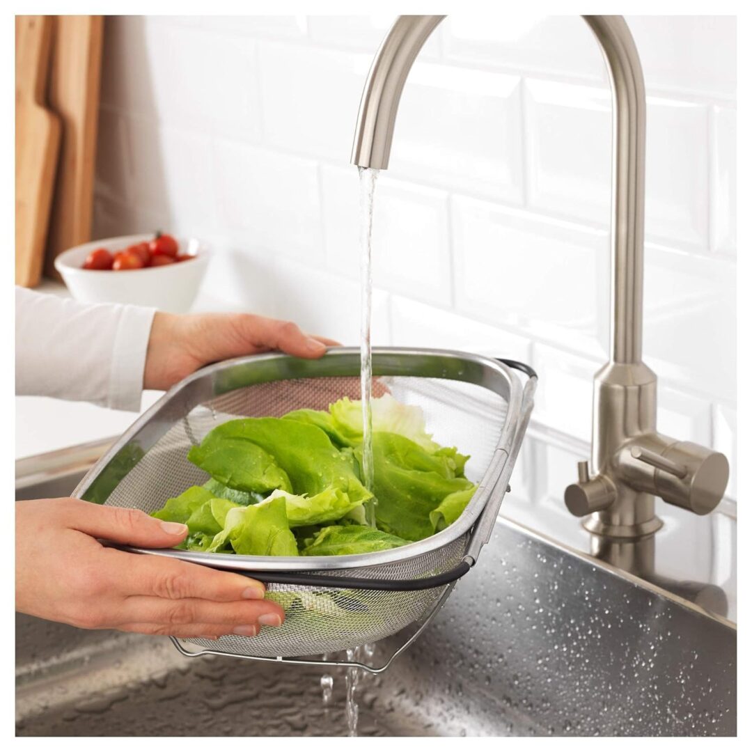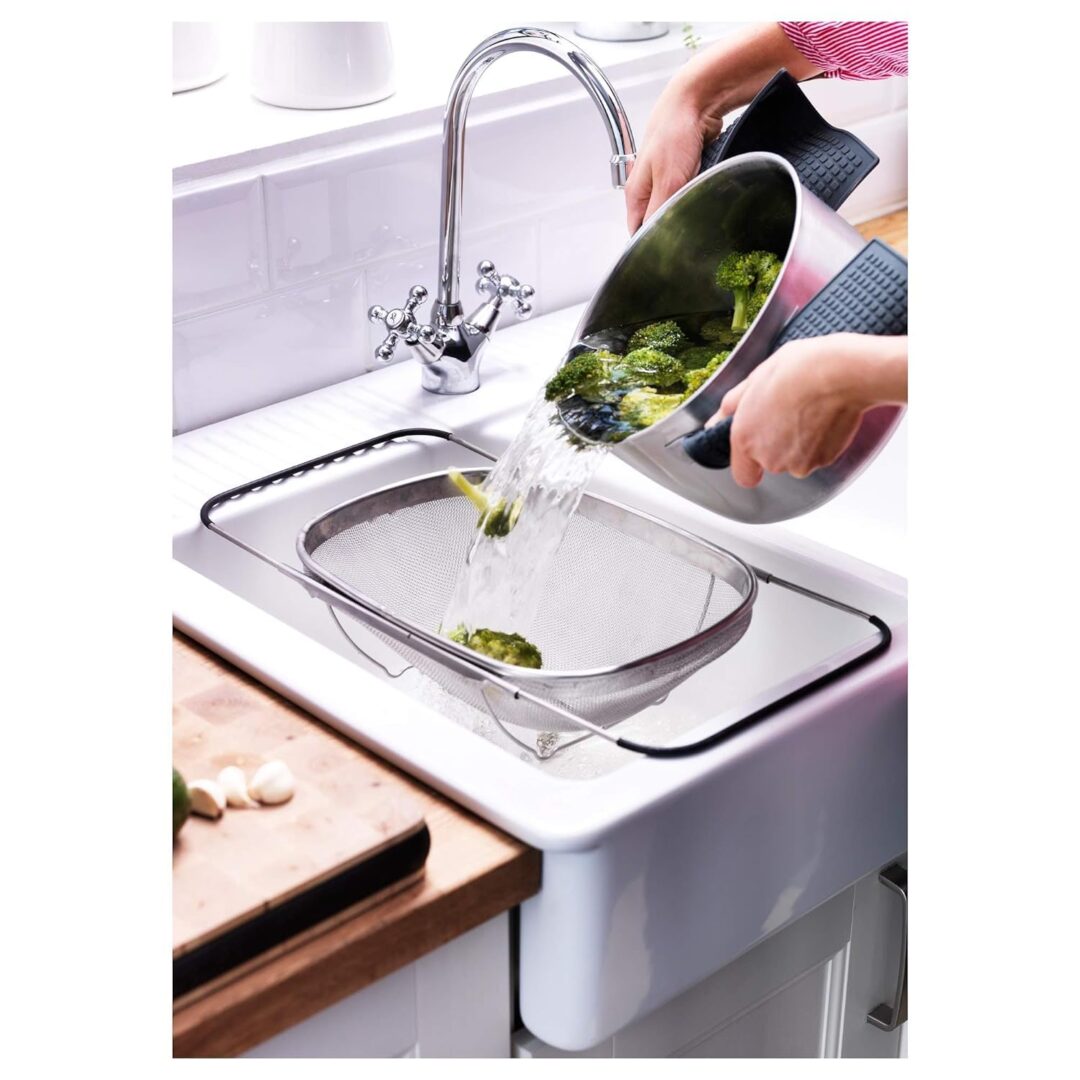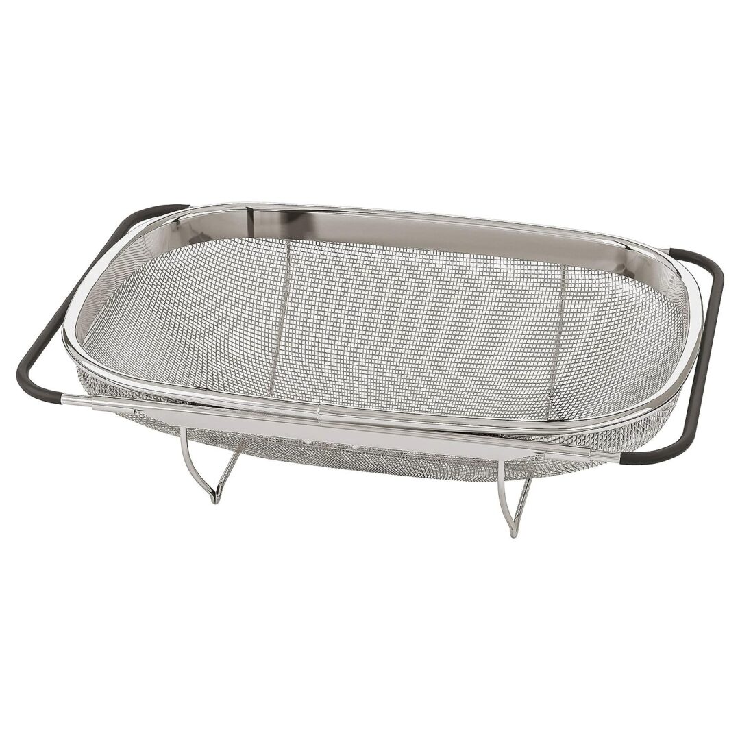 Plastic-covered handles make the colander rest safely on the edge of the sink bowl. Material Stainless steel, Polyethylene plastic Care Dishwasher-safe. rice strainer with handle