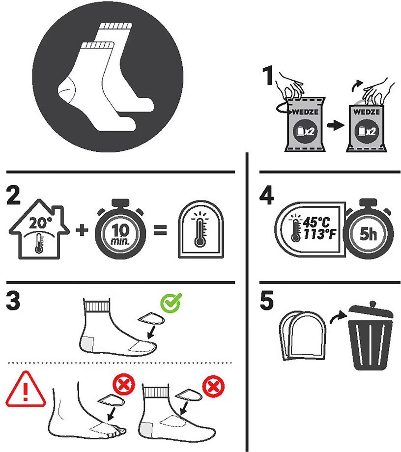 • The warmer must be placed in the shoes when very warm to last 5 hours.